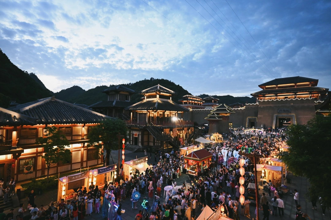 从螺蛳壳下山,都匀秦汉影视城里,身着汉服的游客们,跟着NPC扮演角色,沉浸式穿越千年;