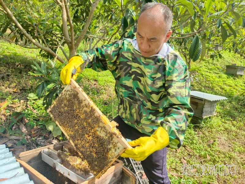 在纳容村养殖点,蜜柑林间整齐摆放着蜂箱。管理员班国富看着蜂脾上溢出的蜂蜜喜笑颜开:“这季蜜质好,预计每箱可采5斤,150箱能产750斤。”