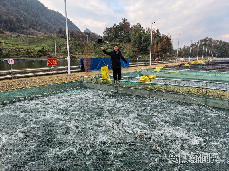 噜嘎漂浮槽养殖基地,工作 人员投食喂鱼