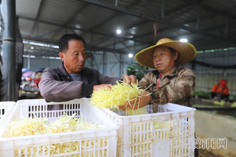 西秀区贵柯农蔬菜部几年前入驻河桥村开始种植韭黄,如今,360亩韭菜种植基地已成为粤港澳大湾区“菜篮子”生产基地。进入该企业生产基地,只见遍地套着遮阳罩的韭黄即将迎来收割期,十多名工人正忙着清洗分拣韭黄。