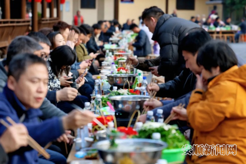 活动现场设置了丰富的文化体验环节。八音坐唱、篝火晚会、头帕舞等民俗表演及勒尤、月琴、铜鼓等民乐演奏吸引游客纷纷驻足互动,亲身感受布依文化的活力与热情。同步推出的“暖冬汤锅”餐饮体验,将这场文化盛宴推向高潮,一口口汤锅热气蒸腾,散发着浓郁醇厚的香气,现场气氛热烈,洋溢着暖意融融的烟火气息。