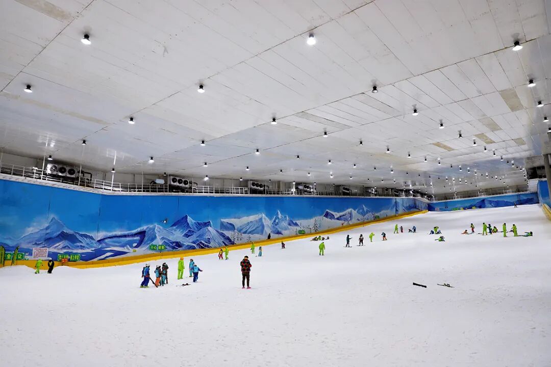 游客在关岭奇缘谷冰雪小镇体验室内滑雪