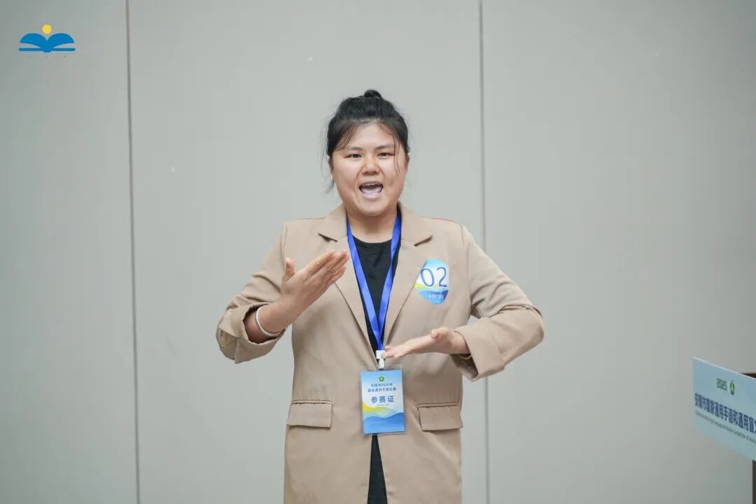 在国家通用手语赛场,教师组、听障学生组、听障人士社会组的选手依次登场竞技。通过“自我介绍”“看词语打手语”“公开课堂”三个环节的精彩比试,杨镕菲、罗欢、赵叶金分别荣获所在组竞赛项目的一等奖,李德艳、张鸿森、卿桂君等5名选手分别荣获二等奖,曾宗靖、郭洪怡、刘嘉玲等7名选手分别荣获三等奖。