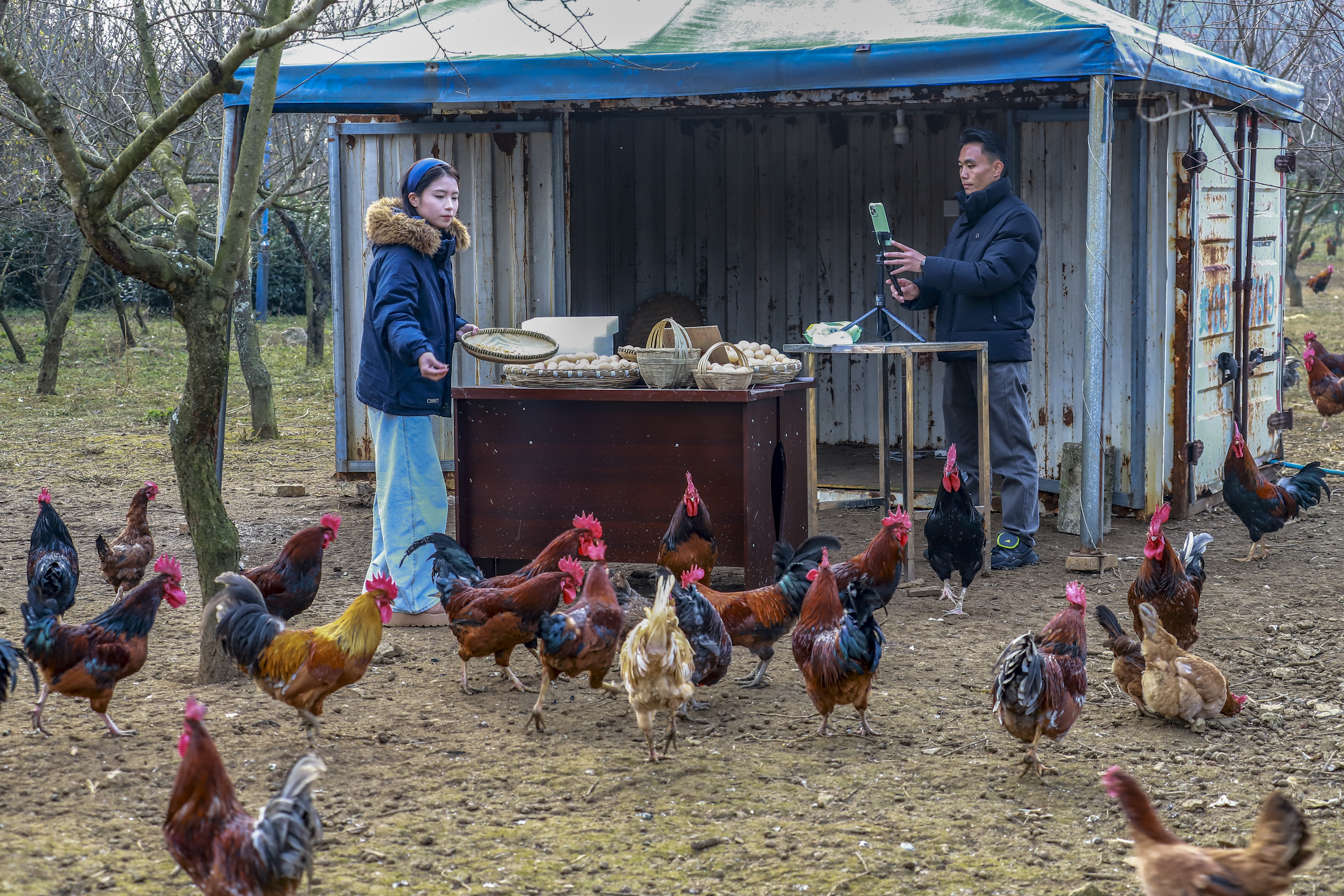 12月25日,记者在西秀区七眼桥镇金鸡农庄生态农业发展有限公司看到,工作人员正通过网络直播销售鸡蛋和林下鸡。据介绍,农庄通过“公司+合作社+农户”的发展模式,带动周边200余户村民参与种养殖,户均年增收2.4万元。同时,该公司利用网络直播平台拓宽销售渠道,形成了线下销售和电商销售相融合的新业态。