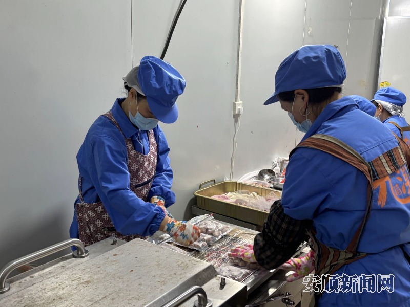 安顺市西秀区九稻溪食品科技有限公司工人熟练地对小肠进行着清洗、加工、包装等工作