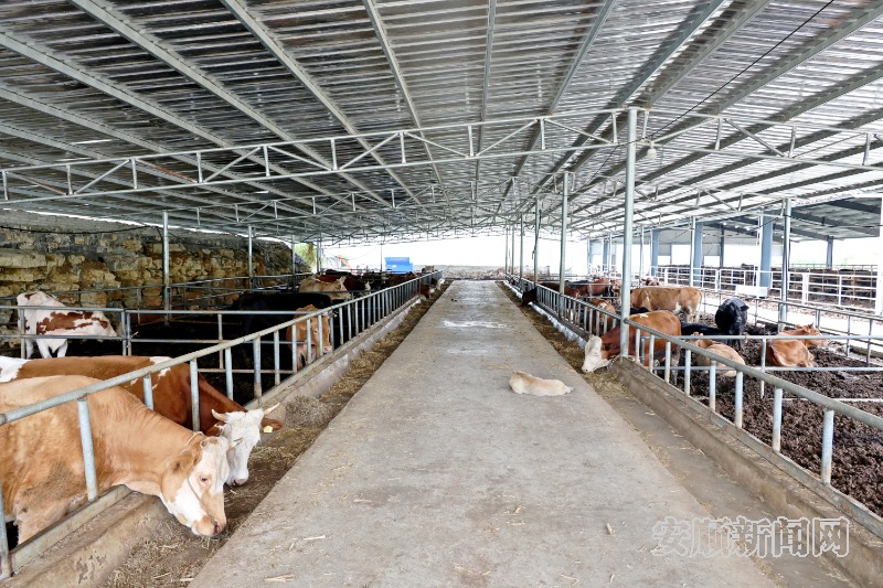 在新铺镇江龙村的连绵山坡上,两米多高的皇竹草随风摇曳,当地养殖大户伍海南打开养牛场的围栏,数十头关岭牛踏着碎步走向草场。