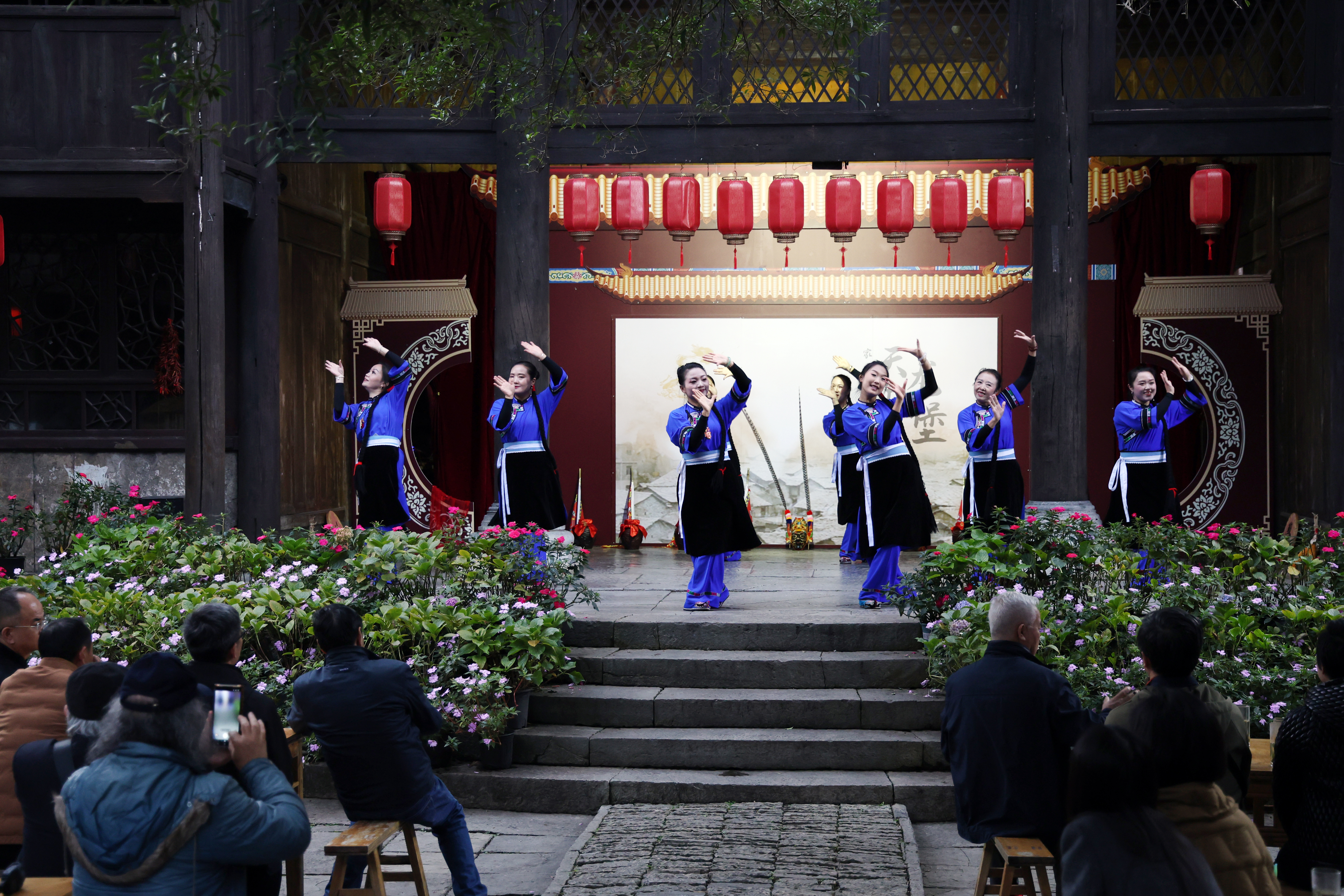 1月1日,在修缮一新的天龙小学堂,悠扬的《屯堡妹子》歌声刚落,民俗表演队的演员们已投入新节目的排练。民俗表演队负责人郑敏介绍,“冬季游客热情不减,我们每天保证8场次的固定民俗歌舞演出。同时,我们会根据当天游客数量和反馈,实时灵活地增开场次,确保精彩不打烊。”除了传统的地戏表演外,山歌、花灯等屯堡非遗也将在近期内轮番上演,让游客沉浸式感受屯堡文化魅力。
