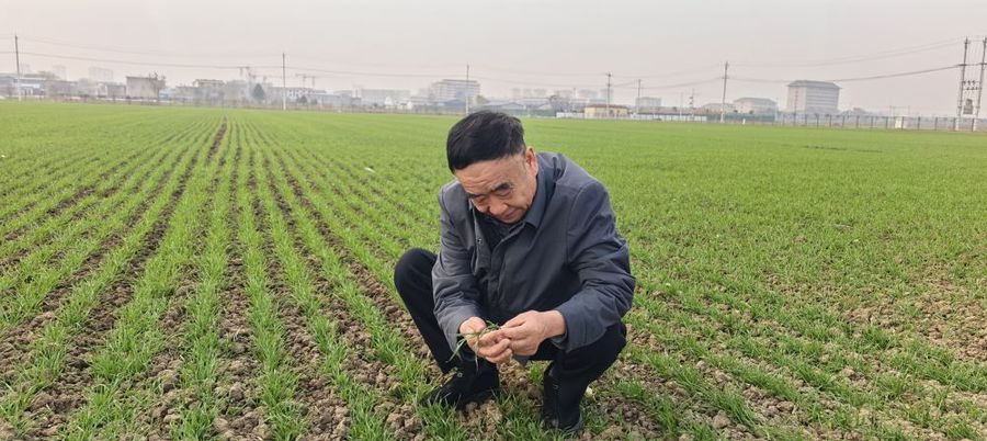 在齐齐整整的麦苗间缓步走了一阵,徐淙祥蹲下身,拔出一小撮苗,细细扒拉,黝黑的脸上露出笑容:“都是3片叶、5条根,处于分蘖前期了,是一类壮苗。”