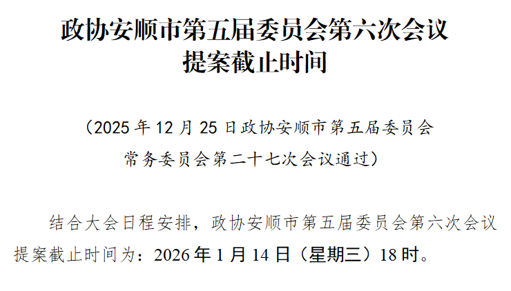 政协安顺市第五届委员会第六次会议提案截止时间
