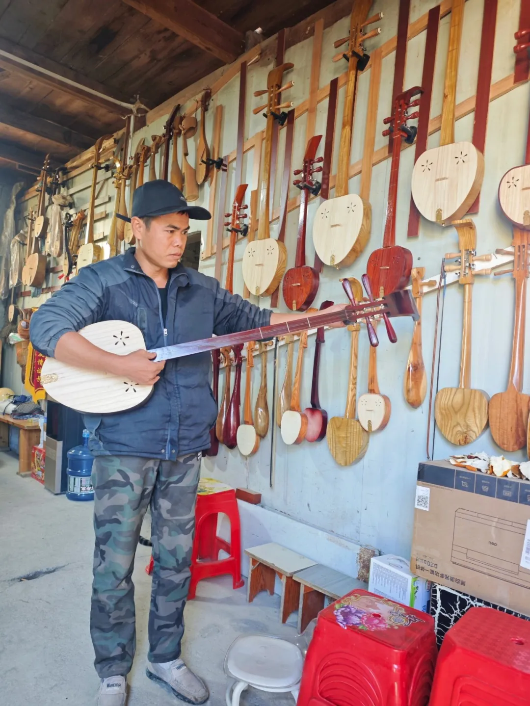 2025年,他带着亲手制作的琵琶登上黔桂湘三省区“村歌”大赛舞台,与侗族大歌同台共鸣。