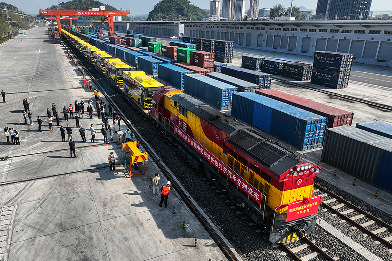 更令人振奋的是,2024年10月,55辆“贵州造”新能源客车首次通过整列中老班列发往老挝万象,服务于当地首条快速公交系统。客车生产企业贵州长江汽车有限公司的国际业务负责人称:“通过这条铁路通道,运输时间比传统海运节省了近20天,极大提升了产品在东南亚市场的竞争力。”