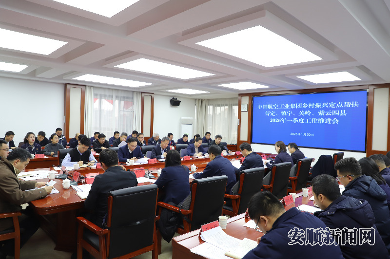 1月30日,中国航空工业集团乡村振兴定点帮扶普定、镇宁、关岭 、紫云四县2026年一季度工作推进会召开。中国航空工业集团党群工作部新闻品牌副总监姚平出席会议并讲话,市委常委、副市长周彬主持会议,市政府副秘书长乔勇,中国航空工业集团贵州区域协调办有关同志、中国航空工业集团选派在安挂职全体干部参加会议。