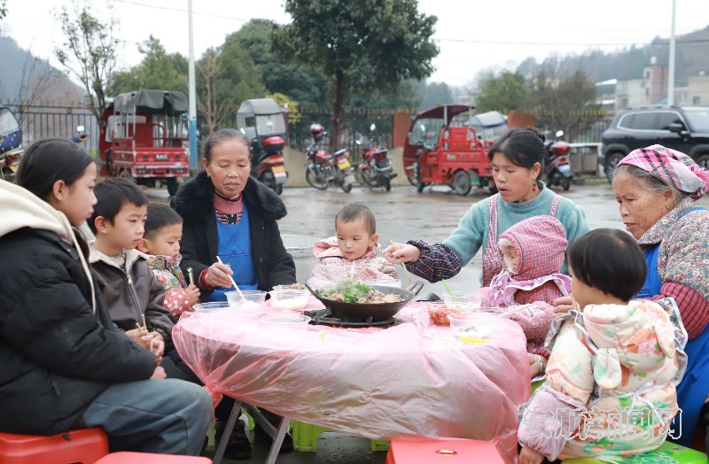 “大家快来坐着吃饭喽!”随着一声吆喝,10余张圆桌旁很快坐满了村民。桌子中央,盆里盛着炖煮好的新鲜猪肉,热气扑面。村民们互相招呼,乐呵呵地举筷,共享这份集体的团圆滋味。