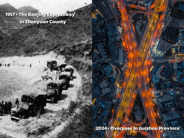 图为1957年镇远县报京路、2024年贵州省内立交桥