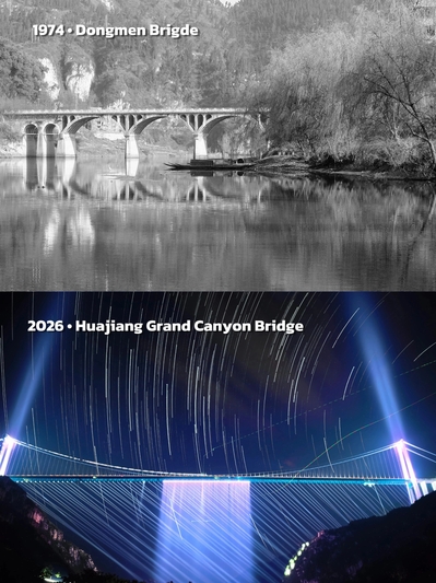图为1974年铜仁东门大桥、2026年花江峡谷大桥
