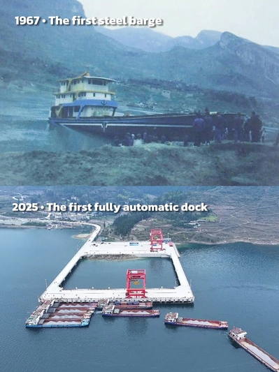 图为1967年贵州首艘钢质驳船、2025年贵州首座全自动码头