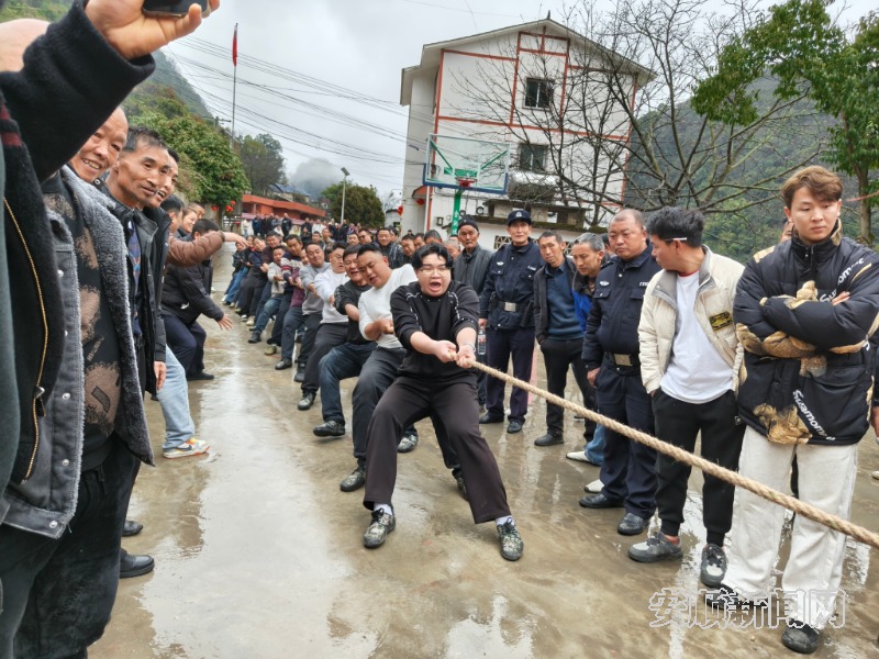 “各就各位——预备!”随着裁判一声哨响,拔河比赛正式拉开战幕。各支队伍齐声高喊“一二、一二”的口号,脚步整齐划一,使出浑身力气往后拉,麻绳中间的红绸带在两队之间来回挪动,僵持不下;赛场周边早已围得水泄不通,围观的村民们踮着脚尖、伸长脖子,一边用力挥舞着双手,一边为队员们加油助威,现场的呐喊声此起彼伏。