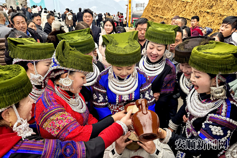 从重庆远道而来的游客韦贤宏刚到观景台路口,便被当地群众的热情所感染,数十位苗族妇女站成一排拦着路,唱着悠扬的山歌、端着醇香的米酒,正在喜迎八方来客。