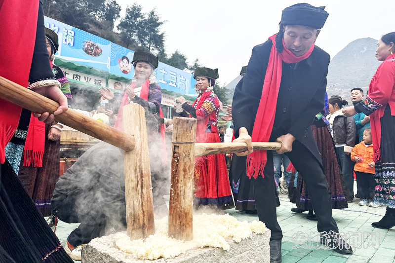 “打糍粑咯!”随着一声吆喝,热气腾腾的糯米被倒入石臼之中,两位本地村民抡起木槌开始交替捶打,在木槌的起落间,糯米渐渐变得绵密黏糯;四周游客纷纷围拢过来,有的拿出手机拍照录像,有的按捺不住准备上前“接力”。打好的糍粑被端上桌案,身着苗族盛装的妇女们带上手套舀豆馅、包糍粑,陆续发放给现场游客品尝。