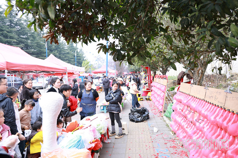 一旁的娱乐区同样热火朝天。套圈摊位前,彩色圆环在空中划出弧线,孩子们攥着圈大喊“中中中”;打气球摊位的枪声此起彼伏,大人小孩轮番上阵。欢声笑语在集会上空回荡,每一处角落都洋溢着马年新春的喜庆与欢乐。