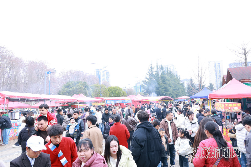 大年初三,若飞公园的新春集会热闹非凡,吃喝玩乐一应俱全,吸引众多市民游客前来休闲游玩、感受年味。林园路两旁,商贩叫卖声与游客欢笑声交织,游客手中或攥着糖葫芦、或拿着烤串,脸上漾着笑意。