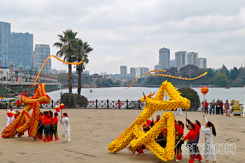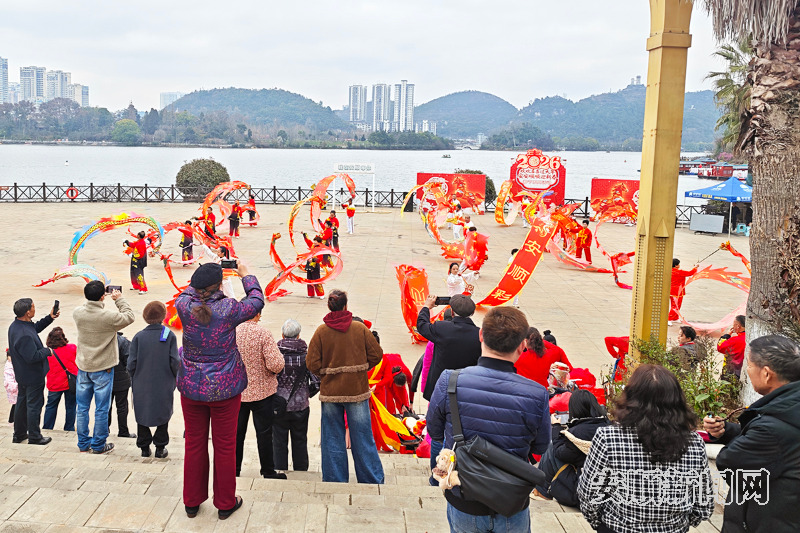 好戏连台、精彩不断。欢快喜庆的腰鼓舞节奏明快、喜气洋洋,惊险震撼的高杆龙舞技艺精湛、惊艳全场,独具特色的民族舞蹈风情浓郁、韵味十足……丰富多彩的节目为市民献上了一场丰盛的新春文化盛宴。