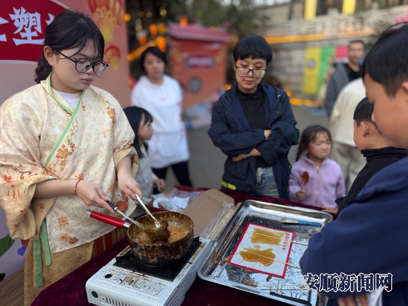 走进习安坊,新春庙会人气很旺。特色小吃、文创产品、年货好物一应俱全,游客们逛市集、品美食、玩游戏,叫卖声、欢笑声连成一片,充满浓浓的市井年味。非遗糖画、手工剪纸摊位前挤满了小朋友,大家近距离感受传统年俗的乐趣。“我们从深圳来安顺过年,真切体会到这里的庙会很有地方特色,吃到了特色美食,逛得很开心。”游客李丹说。