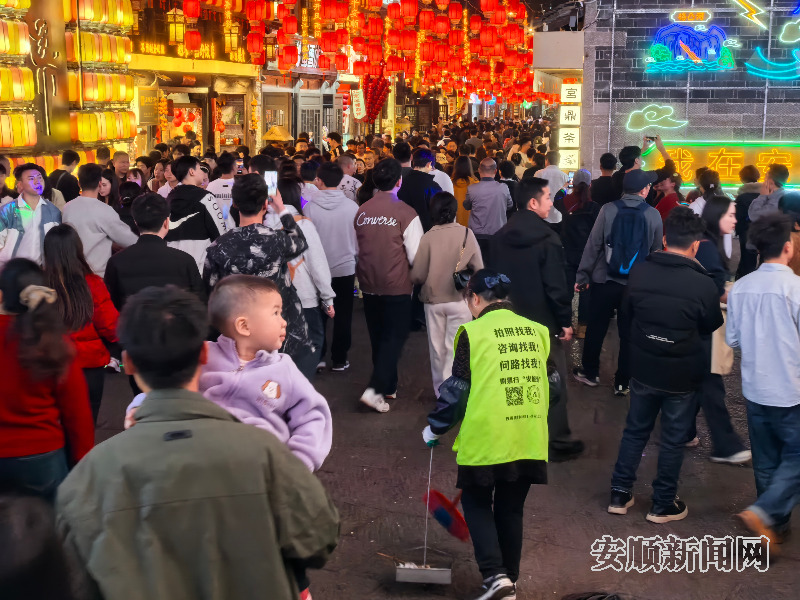 大年初七,在安顺古城步行街,安保人员始终穿梭在人流中,他们的工作早已超出传统安保范畴。从日常的来回巡查、随手捡拾白色垃圾和烟头,到及时劝阻街道摆摊设点行为,维护街区经营秩序,每一个细节都彰显着责任。安保人员杨胜芳介绍,团队实行24小时两班倒制度,单班值守12小时,十余位安保人员轮班在岗,时刻紧盯古城动态。面对游客因拍照打卡、排队等引发的矛盾纠纷,安保人员总能第一时间上前化解,用耐心沟通及时平息矛盾,保障游览秩序井然。此外,针对人群围观、道路堵塞等情况,安保人员也会快速疏导,确保古城内通行顺畅。