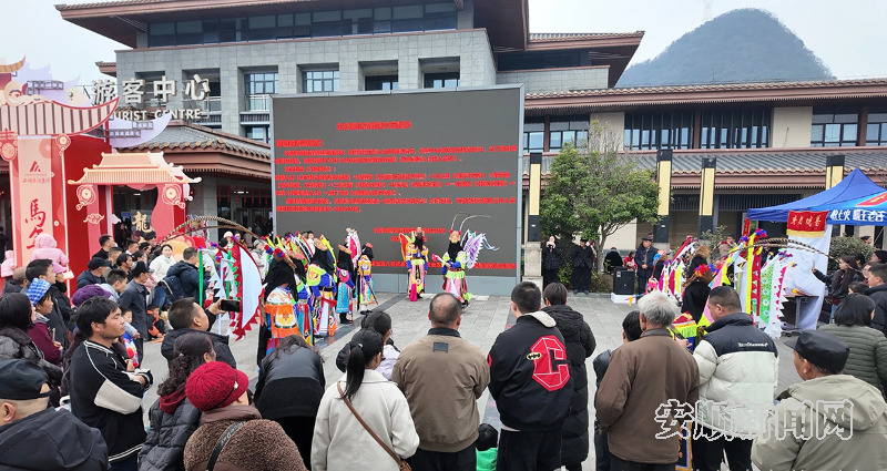 不仅景区内好戏连台,新城广场更是热闹非凡。精彩的地戏表演,古朴唱腔搭配刚劲舞姿,引得台下游客纷纷拍照留影,掌声与喝彩声此起彼伏。由少数民族服饰队、西游主题方阵、生肖马服饰队、舞龙队等组成的特色巡游队伍,一路缓缓前行,将节日的喜悦传递给大家。非遗年味市集同样备受青睐,蜡染、木雕、织锦、银饰等非遗文创产品琳琅满目,“马年主题非遗区”的限定产品更是成为游客追捧的热点。