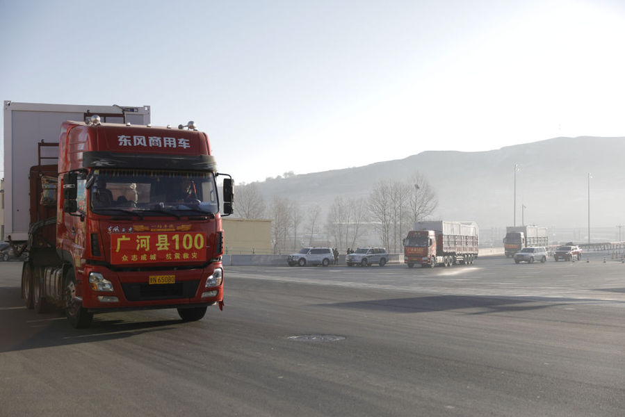 2023年12月26日,在甘肃省临夏州积石山高速出口,载着活动板房的货车驶向受灾乡镇。新华社记者 方欣 摄