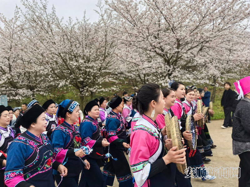 步入活动现场,漫山樱花如云似雾,粉白花瓣随风轻舞,与布依特色民居、田园风光相映成趣,多处沉浸式打卡点引得游客驻足拍照,登高便可尽览连绵花潮,移步皆是春日美景。活动现场氛围热烈,布依拦门酒温情迎客,身着传统服饰的布依儿女唱着酒歌,以醇香米酒礼遇远方宾客;特色节目轮番上演,竹筒舞、樱雨布依摇、糠包舞等民族舞蹈灵动活泼,非遗抵杠表演尽显力量与民俗魅力,本土歌手带来的《奢香夫人》《安顺风华》等曲目,更是将现场氛围推向高潮。