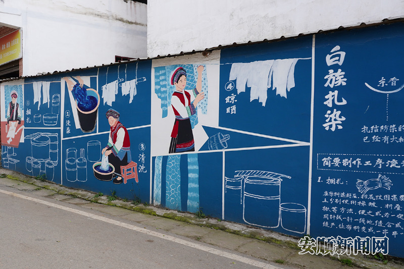 2025年11月,该村邀请专业彩绘团队对村内主干道民居墙面统一设计绘制,将白族青瓦白墙肌理、苗族银饰纹路与民族舞姿等巧妙融合,把民族团结政策、传统美德、乡村新风尚融入艺术创作,让空白墙面变成“文化课堂”与“风景画廊”。