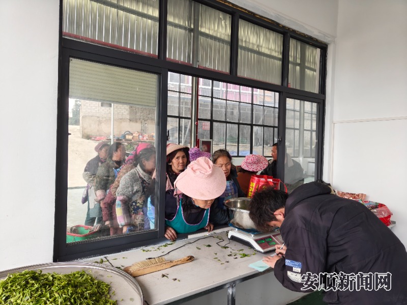 走到山脚的茶青收购处,村民们正排队结算茶青,成交的声音此起彼伏,热闹非凡。来自岗乌镇纳磨村的村民赵文珍今年63岁,将采摘的4斤茶青拿来过称,她说:“我平时在家带孙孙,现在孙孙去学校读书,一个人在家闷燥很,就过来采茶,一早上可以采三四斤,一天有个百把两百块,挺不错的。”