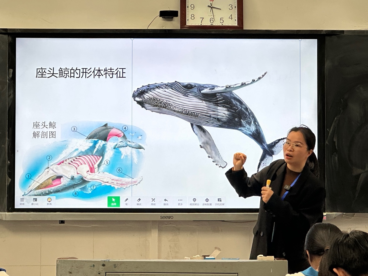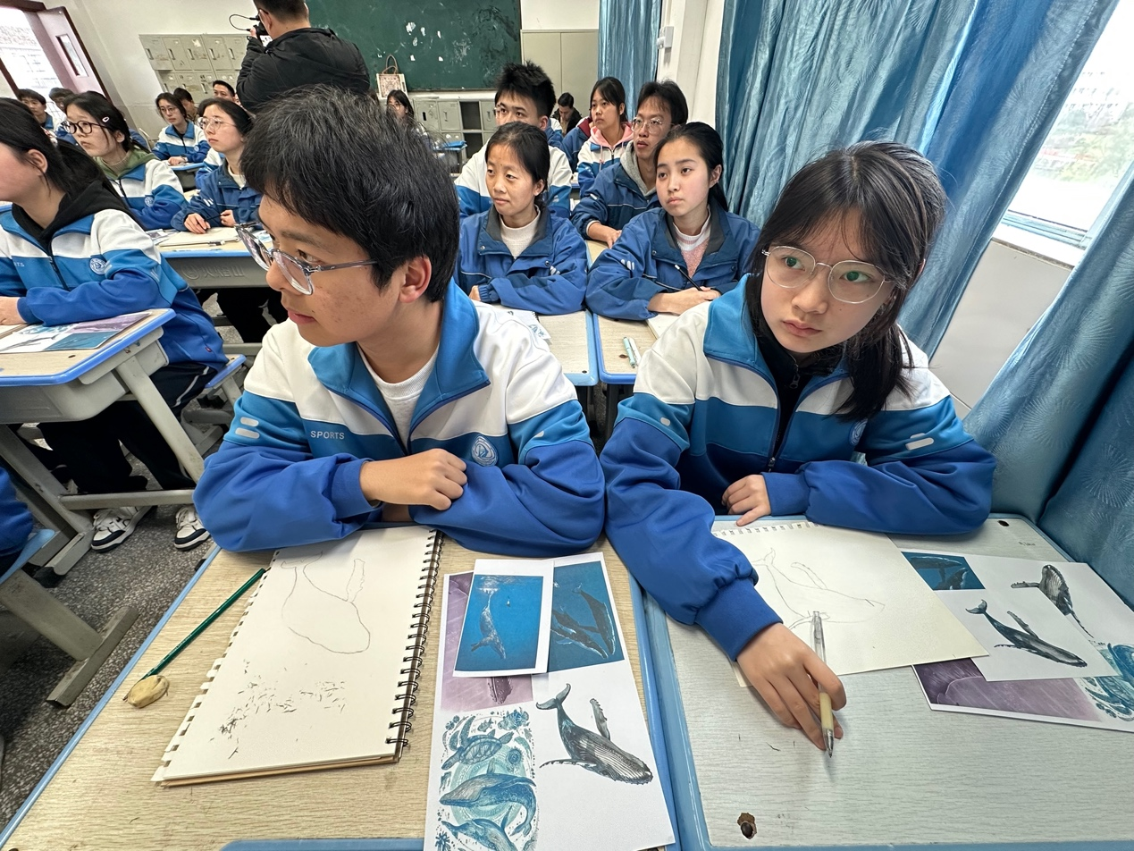福建省龙岩市长汀县河田中学美术老师俞新燕将座头鲸和大海作为海报设计的主角,让同学们在设计中感受海的美学:“成年座头鲸大概有15到18米长,体重达到30吨,它的鳍也非常长,大概占了身体的1/3。庄子有一篇文章叫‘北冥有鱼,其名为鲲’,很多绘画会把座头鲸作为鲲的形象去画。”