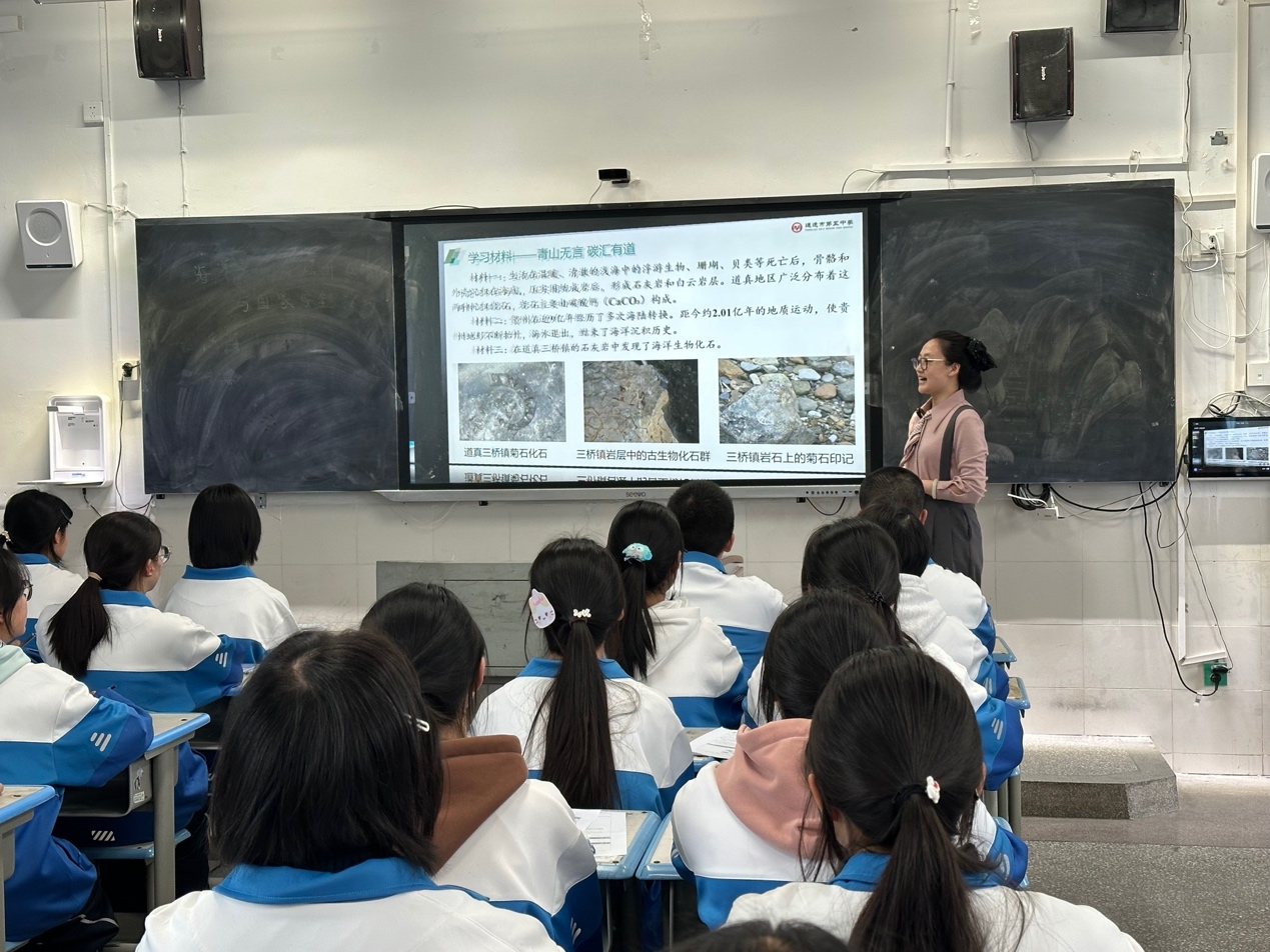 来自内蒙古通辽市第五中学地理老师刘菲上完课后与记者分享自己的备课心得:“道真曾经是古海洋,今天道真的喀斯特地貌,通过地下水等水循环把岩石物质汇入海洋。如何培养孩子们的海洋意识,不是喊口号,而是切切实实让孩子们意识到道真和海洋有密不可分的联系,从而为海洋强国事业作出贡献。”