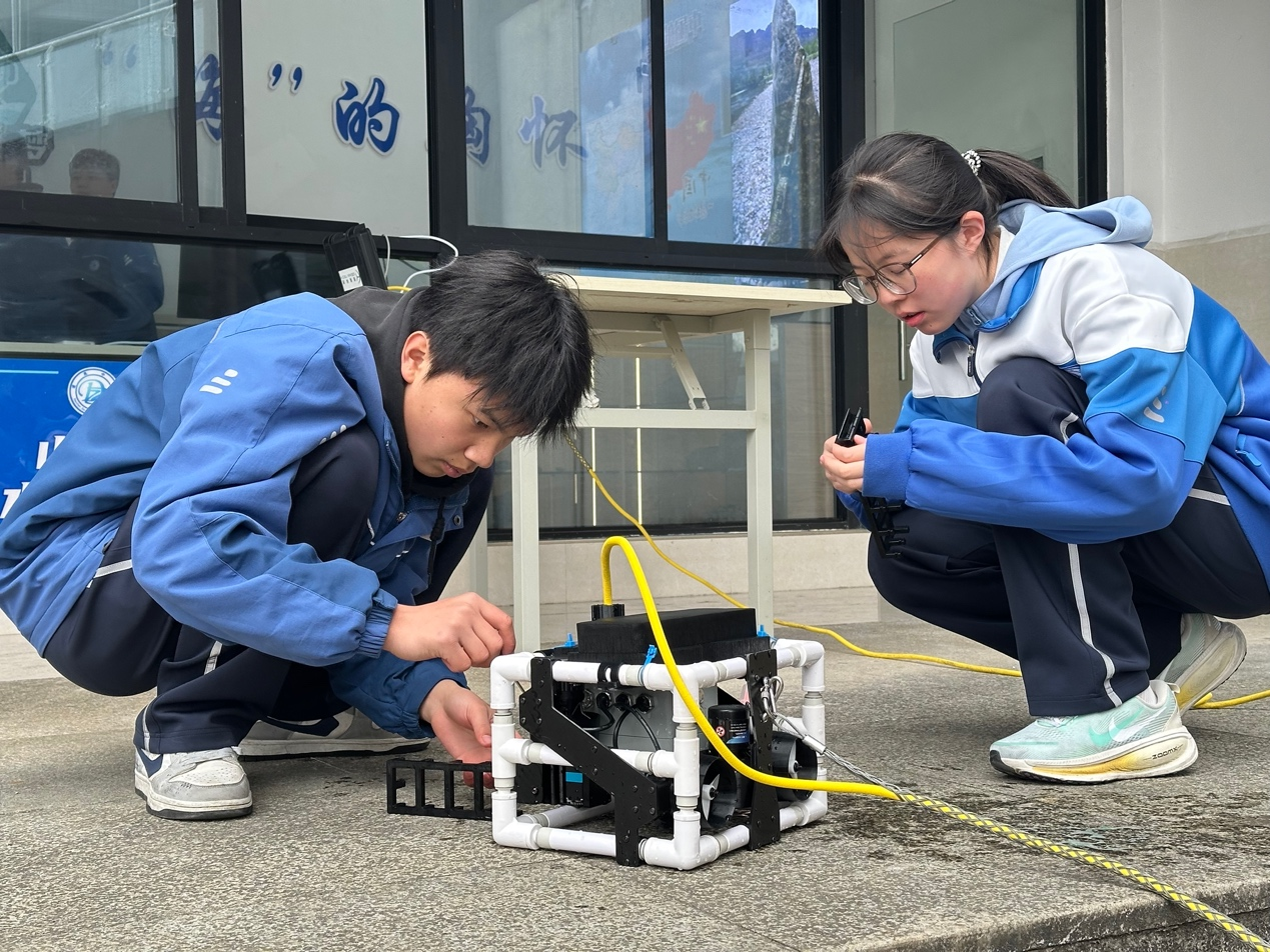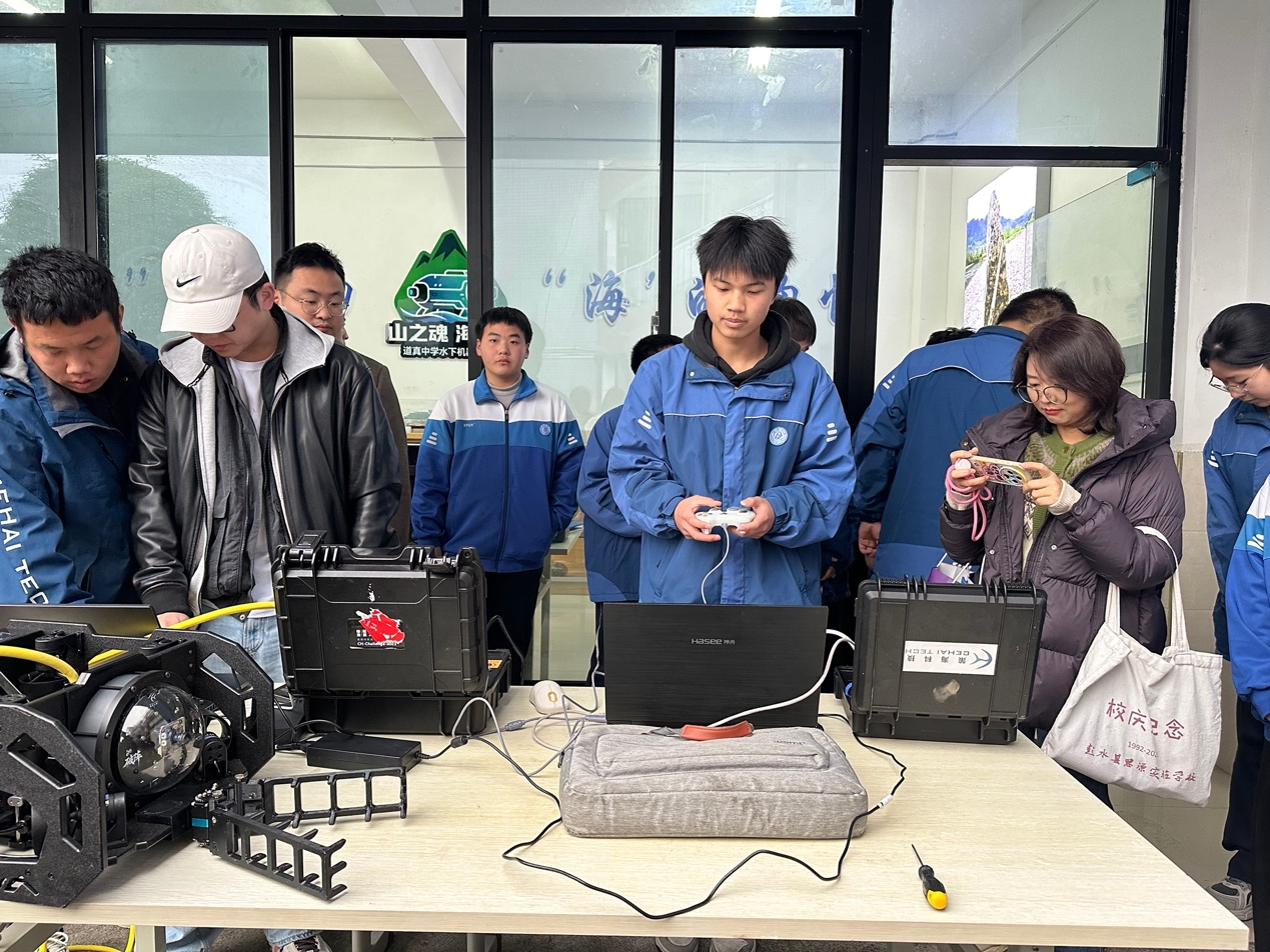 一大早,道真自治县道真中学高一年级的同学就在老师的带领下调试水下机器人设备,今天他们将迎接来自15个省(市区)29所中学的负责人及嘉宾的参观。