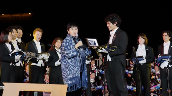 当晚,“大鸾和鸣·天地交响”文化交流专场晚会在肇兴侗寨拉开帷幕。Whiffenpoofs合唱团、贵州村歌团、侗族大歌艺术团、剑河村歌团、黄岗男声侗族大歌队、飞越彩虹栽麻侗族童声合唱团等多支队伍轮番登场。其中,Whiffenpoofs合唱团和贵州村歌团携手共创的《地球村歌》,以歌声联结中外,融合民族与世界,成为当晚最动人的篇章。