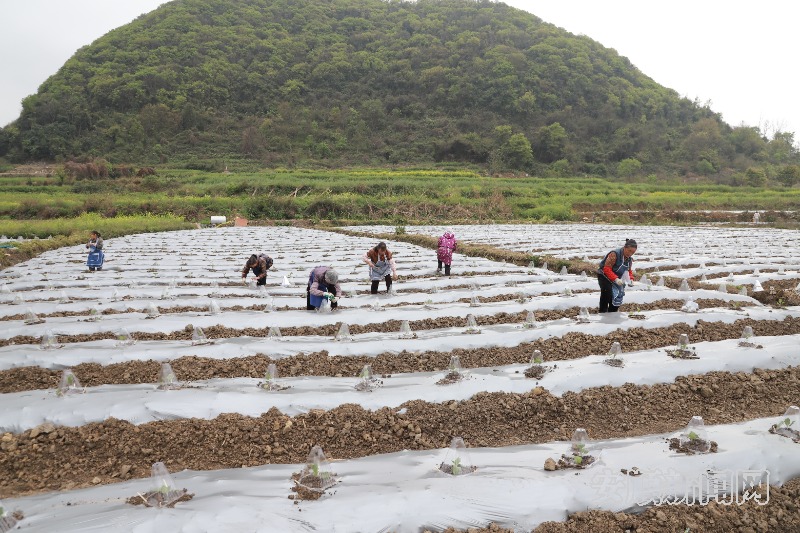 沿着村道往山背后走,一片茄子地里,10多个工人正弯腰忙活着。他们并非移栽茄苗,而是给每一株苗罩上塑料盖。“这是防冰雹的,还能保温。”安顺汇德农业有限公司负责人邱雄介绍道。