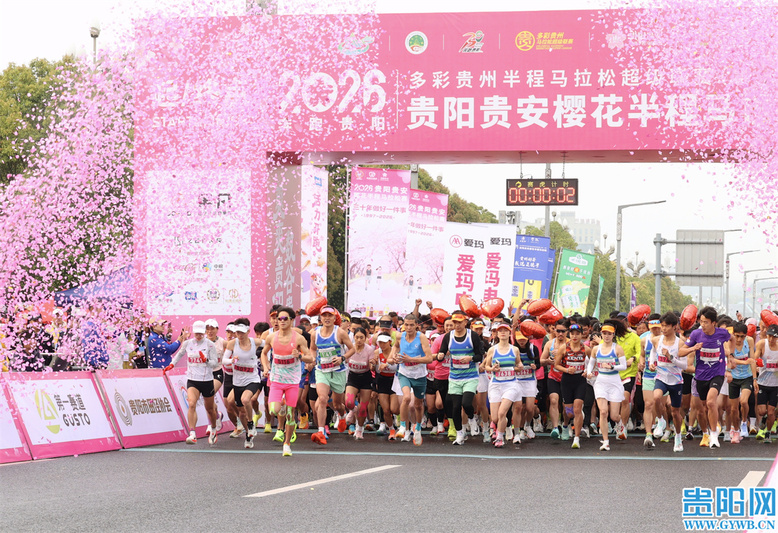 3月29日上午8时,2026多彩贵州半程马拉松超级联赛(第一站)暨贵阳贵安樱花半程马拉松在樱花园畔精彩鸣枪。6000马拉松爱好者从贵安新区规划艺术馆出发,沿着百马大道、清安大道、数谷大道等路段奋力奔跑,最终返回起点,在漫天樱花与清新空气中完成了一场“体育+文旅”的春日之约。