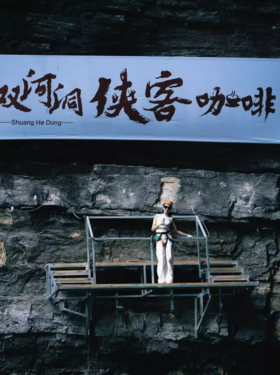 2025年五一期间,“双河洞侠客咖啡”上线,游客需徒步穿越5公里地下河谷,通过120米绝壁飞拉达攀岩,才能抵达位于60米高空钢索上的咖啡馆,脚下是地下暗河和峡谷,远处是天坑瀑布,这样的极致体验让相关视频在抖音获赞超200万次 。