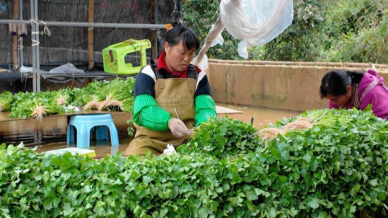 另一边香菜种植区,翠绿香菜长势喜人,清洗池旁工人忙着清洗、捆扎,新鲜香菜即将装车发往贵阳。“公司大棚总面积有300亩,分为两个板块,菊花种了100多亩,香菜也种了100多亩。菊花主要靠出口,香菜主要送到贵阳配送。”姜龙艳说,基地香菜亩产约2000斤,四季可采收,日均外销1000余斤,实现产销两旺。