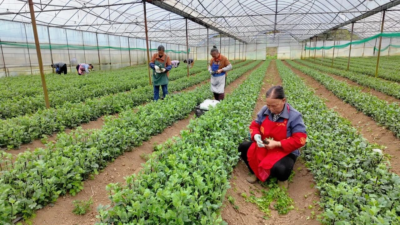 在菊花种植大棚里,刚栽种的菊花苗在喷灌滋润下茁壮生长,20余名工人正熟练掐苗、分拣、装袋,按60棵一袋的标准精心打包,既满足自家种植需求,也为外销种苗做足准备。