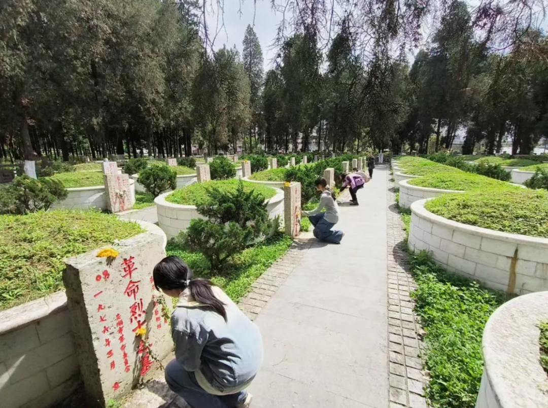 在庄严肃穆的烈士陵园内,全体人员整齐列队,集体默哀三分钟,深切缅怀革命先烈。青少年代表手捧鲜花,缓步走向烈士墓碑,郑重献上鲜花,以质朴方式表达追思与敬意。祭扫过程中,老师向孩子们讲解移风易俗、文明祭祀的重要意义,引导大家以鲜花祭奠、植树缅怀、网络祭祀等绿色环保方式追思先人。