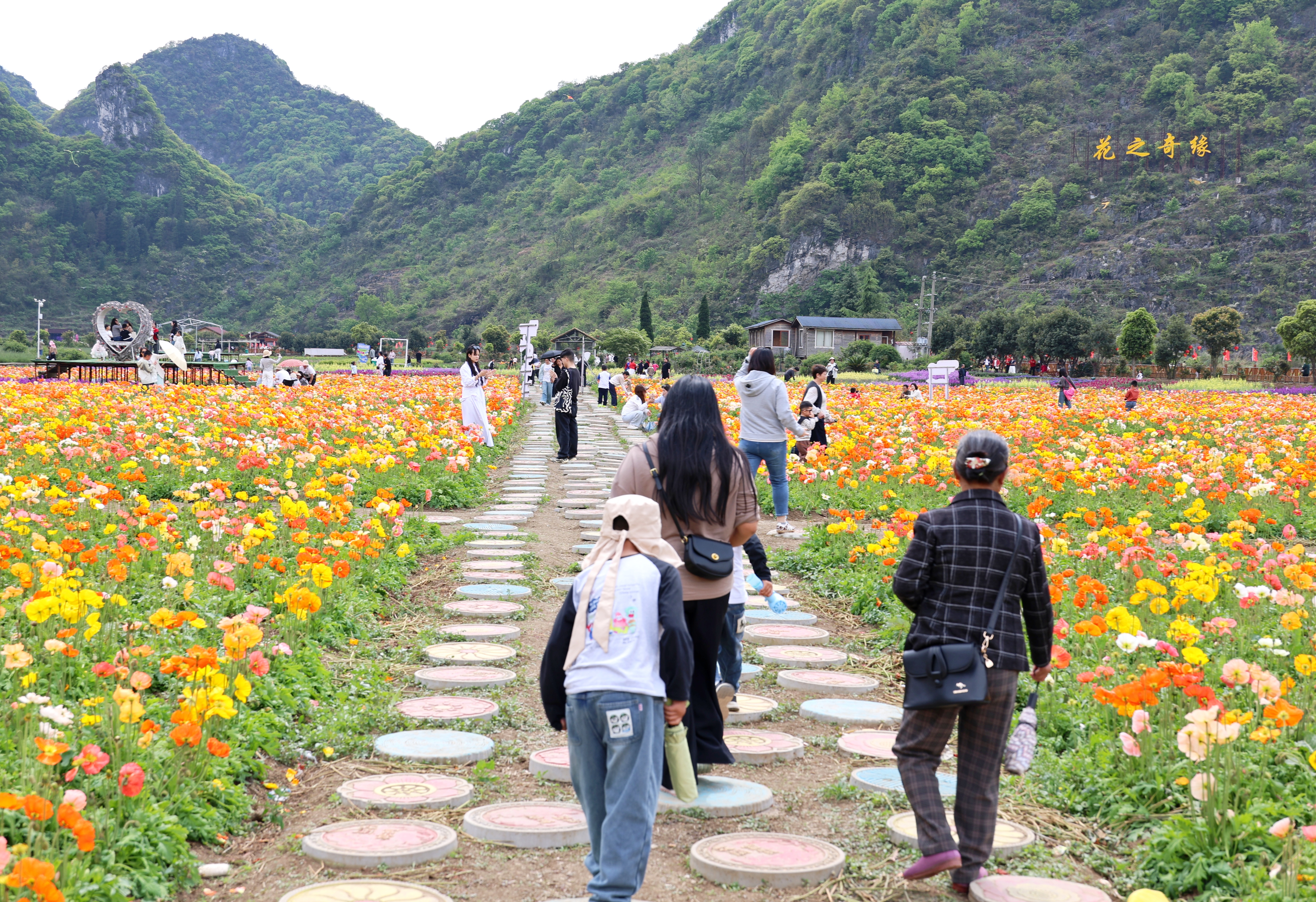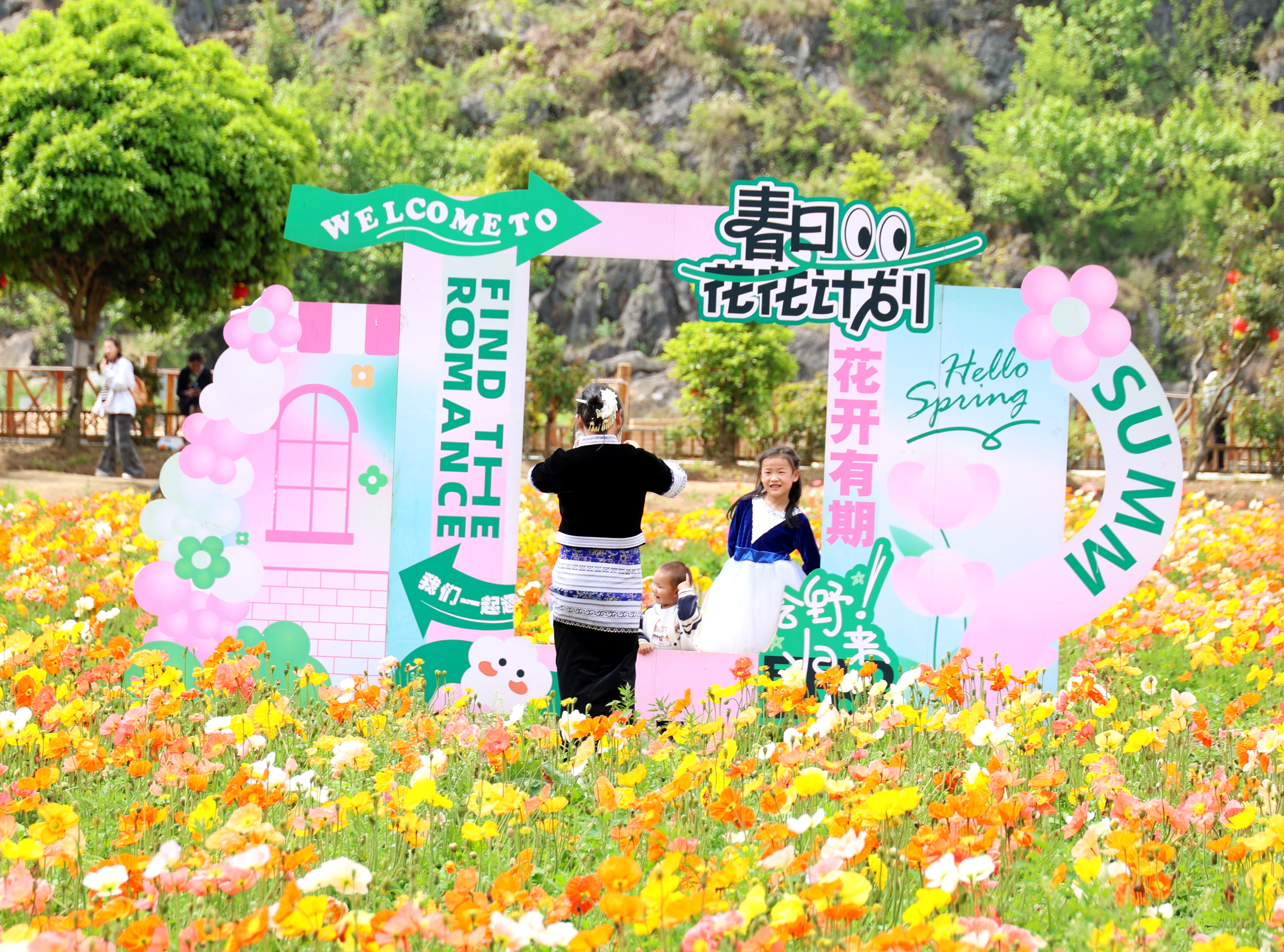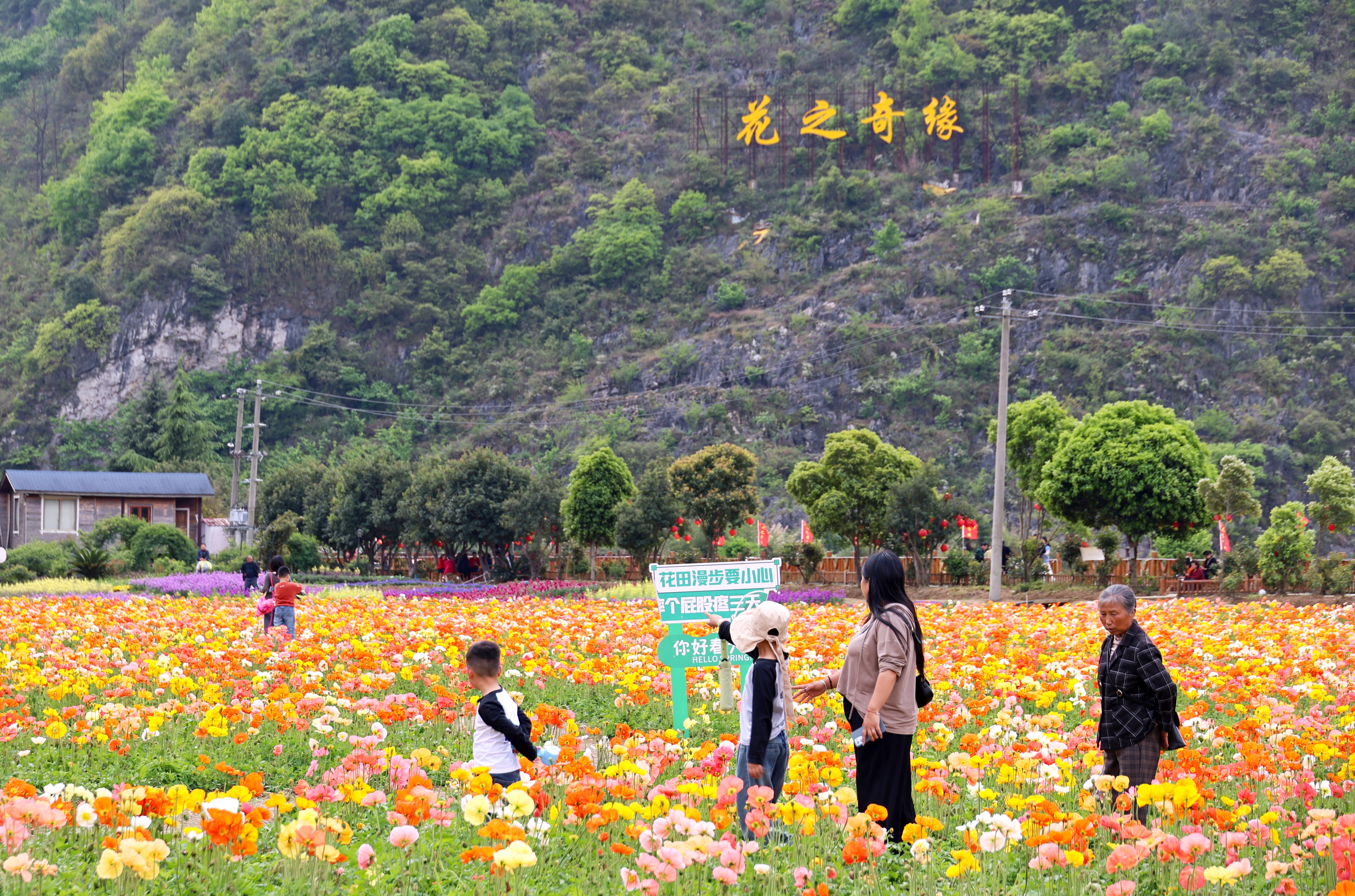 春风送暖,百花争艳。在位于黄果树旅游区龙宫镇下苑村的“花之奇缘”农业观光园内,以虞美人为主,紫荆、角堇等为辅的百亩花海迎来盛花期,数十万株花卉交织成春日里的限定美景,吸引了大批游客前来打卡游玩。