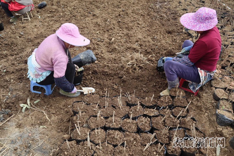春和景明,万物勃发。4月4日,天气晴暖,微风拂过平坝区天龙镇打磨村的山野,漫山遍野的箬叶郁郁葱葱、长势喜人。在村口不远处,该村种植大户陶红正有条不紊地组织工人,对新引进的优质粽叶品种进行育苗、定植。